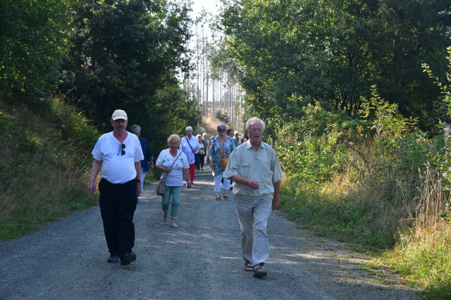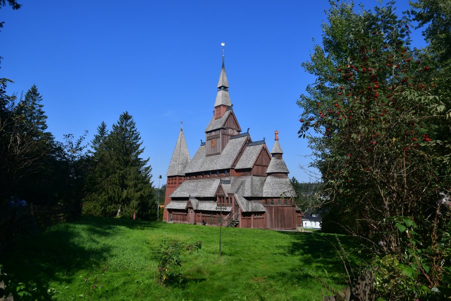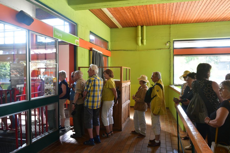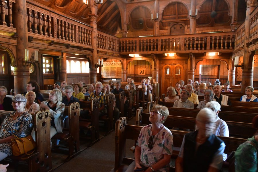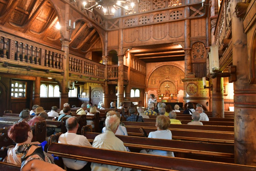 Die allgemeinen Wetterprognosen für den 5. September, dem Reisetag, waren Sonne, Sonne, Sonne und Temperaturen über 30 Grad Celsius. Doch im Gebirge angekommen, empfing die Reisegäste ein frisches Lüftchen. Auch wenn der von Busfahrer Christian versprochene Kaffee ausfallen musste, weil sowohl der Busparkplatz als auch die Toiletten an der Talstation der Kabinenbahn nicht sofort gefunden wurden. Die Reisegruppe traf trotzdem pünktlich an der Stabkirche in Hahnenklee ein, um hier bei einem Vortrag etwas über dieses besondere Bauwerk zu erfahren. Da Fichtenholz deutlich preiswerter war als Stein auf Stein zu mauern, hat sich die Gemeinde Anfang des 20. Jahrhunderts für einen Holzbau entschieden. Entstanden ist ein Meisterwerk, dass heute sogar von norwegischen Reisegesellschaften aufgesucht wird.