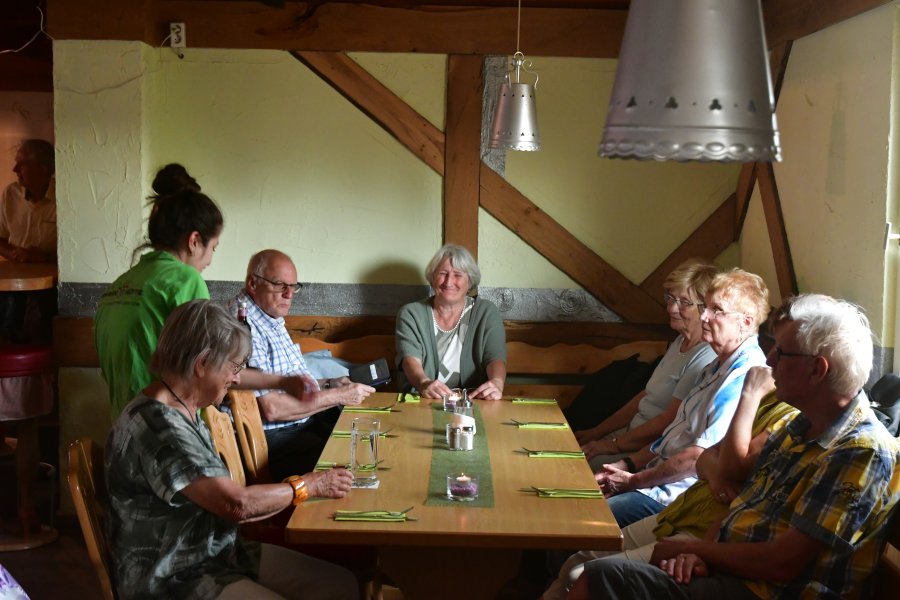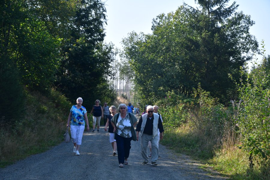 Nach dem Genießen der schönen Aussicht und der Betrachtung spektakulärer Freizeitaktivitäten rumpelte die Seilbahn wieder ins Tal und der Bus fuhr für einem Abstecher nach Torfhaus, denn hier gab es einen neu errichteten Turm, dessen Besteigung der Höhepunkt der nächsten Harztour werden könnte, auch weil im Inneren vorsorglich ein Lift eingebaut wurde. Nur wenige Kilometer weiter begann die geplante Wanderung zum Waldcafé Forellenteich. Nach etwa einem Kilometer war das versteckte Kleinod erreicht, so dass ein Streckenposten die schon teilweise erschöpften Wanderer am Vorbeigehen hindern musste. Alle diese Mühen haben sich aber gelohnt. Auf einem gut gefüllten Teller gab es selbst gebackenen Kuchen drapiert mit einer Portion Sahne und Kaffee satt. Die erfahrenen Mitfahrer waren voll des Lobes über die wunderbare Kaffeetafel in der versteckten Waldgaststätte. Appetit auf Abendbrot hatten nach dem kalorienreichen Schlemmen an diesem Tag sicher die Wenigsten.