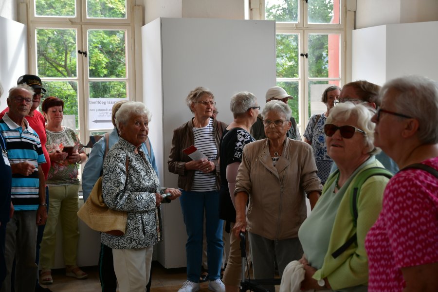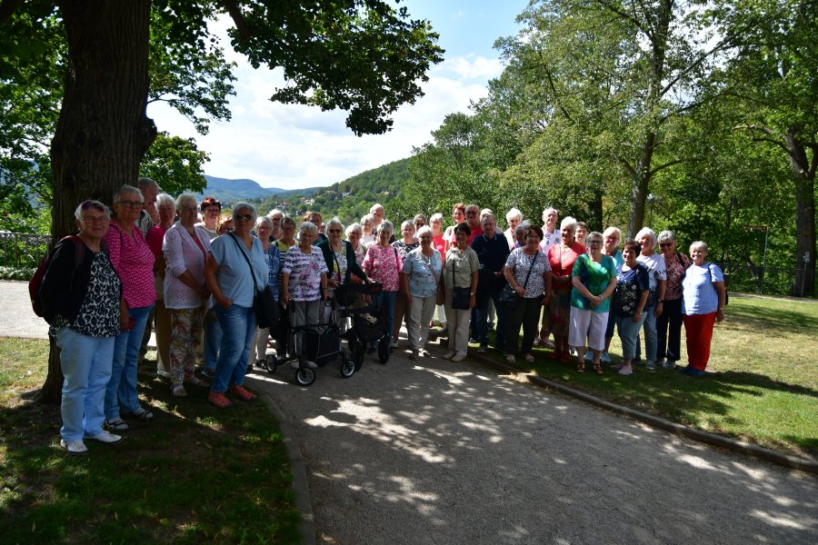 Weiter ging es nach Rudolstadt zu Heidecksburg in die Ausstellung „Rococo en Miniature“. Nach einer kurzen Einführung konnte das fantastische Lebenswerk zweier Herren bestaunt werden, die als Schüler begannen, Figürchen zu formen und so ist aus 50-jähriger Hobbyarbeit eine eigene Welt entstanden, die vergnügliche Entdeckungen für jeden Besucher bereithält. Noch einmal eine wunderbare Aussicht gab es am Hotel Marienturm und dazu einen reichlich gefüllten Kuchenteller. Vor der Heimfahrt versammelte sich die „Sportgruppe“ erneut vor „ihrem“ Reisebus zum obligatorischen Gruppenfoto und kurz vor Mühlhausen erhielt Steffen viel Beifall für seine gezeigten Fahrkünste.