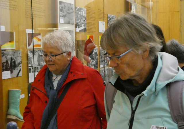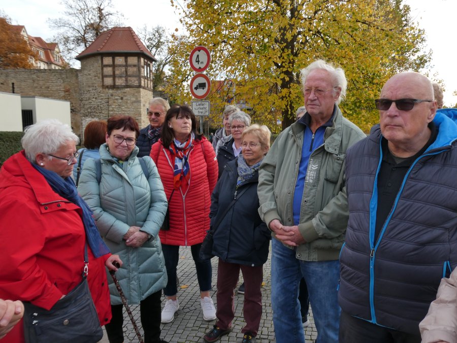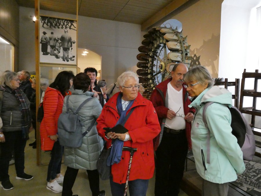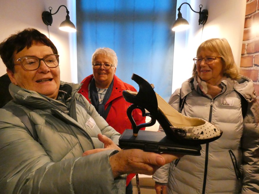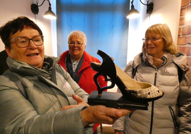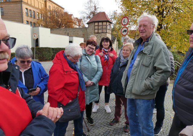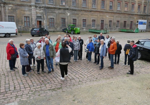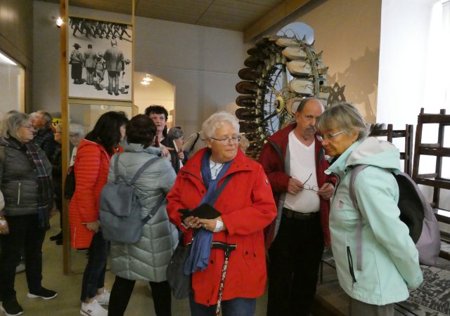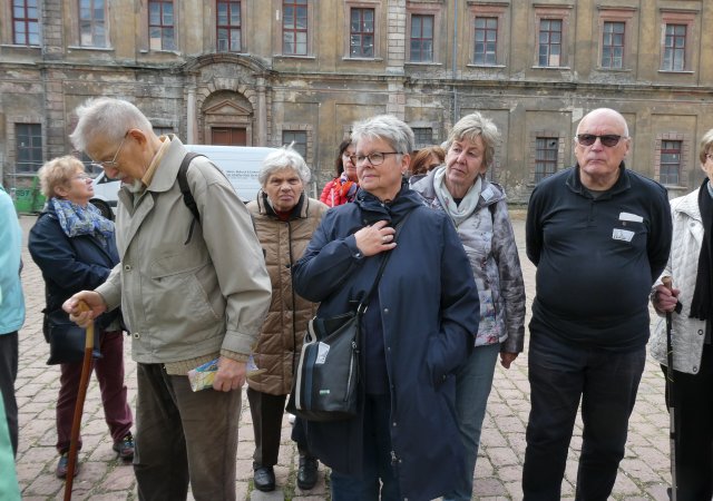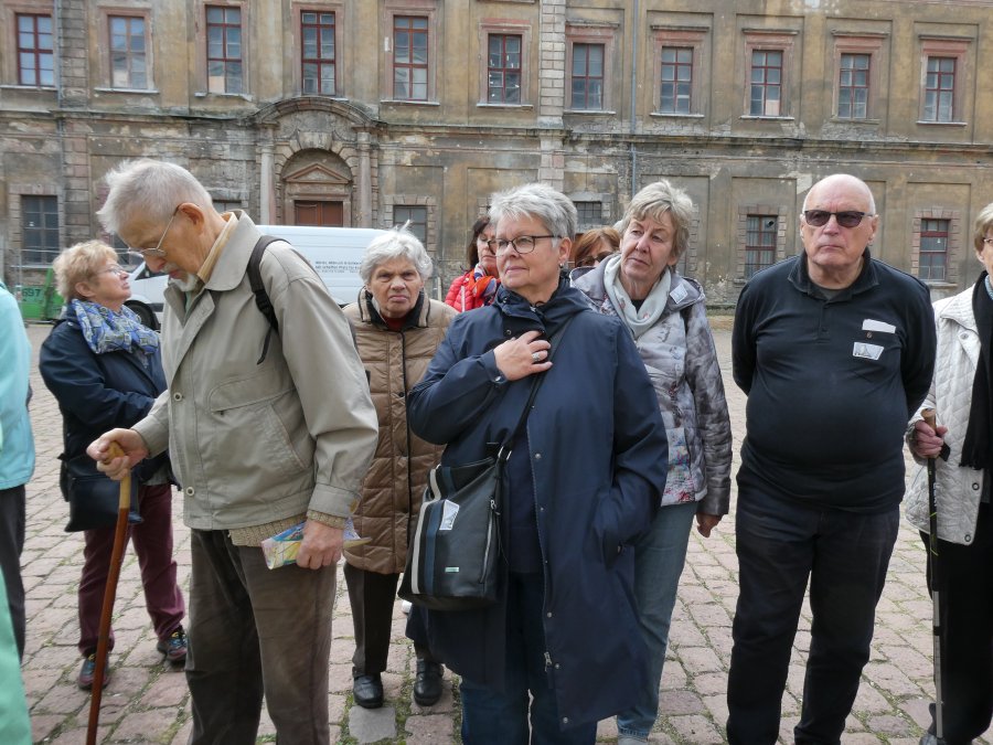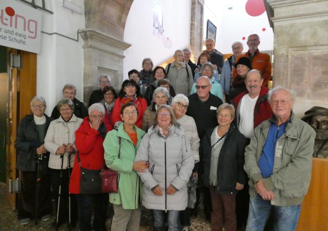 Der Wetterbericht hatte sich nicht geirrt und so war die herbstliche Ausfahrt im Beckerbus schon ein Erlebnis. Erste Station war das Weißenfelser Schloss. Dort gibt es ein Schuhmuseum, denn die Stadt war über sehr viele Jahre ein Zentrum der Schuhindustrie mit fast 5.000 Beschäftigten. Die verloren mit der Wende ihre Arbeit und teilten das Schicksal derer, die auch in Erfurt einstmals Schuhe produzierten. Davon waren auch einige in der Reisegesellschaft unterwegs und so entwickelten sich schnell Fachgespräche mit der Gästeführerin. Leider war die Besuchszeit etwas begrenzt und so musste die persönliche Anprobe ausgefallener Exponate entfallen. Beeindruckend war auch ein Blick auf die „Elbkähne“ von Dirk Novitzki, der die Schuhgröße 54 hat und anderer bekannter Sportler. Auf dem Besichtigungsprogramm stand auch noch ein Besuch der barocken Schlosskapelle und als Zugabe der einer restaurierten Latrine in einem Nebengebäude. Zum Mittagessen wurde die Gesellschaft im Hotel Jägerhof erwartet. Herzlichen Dank an die Geschäftsführung, die es der Reisegruppe ermöglicht hat, Weißenfels, mit warmer Malzeit gestärkt und freundlich bedient, zu verlassen.
