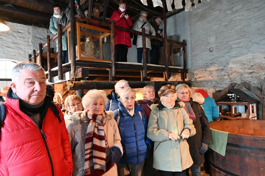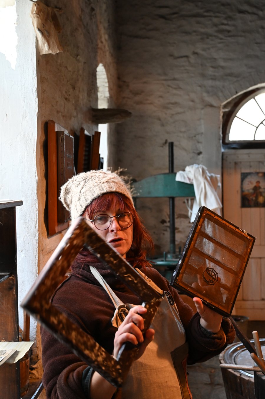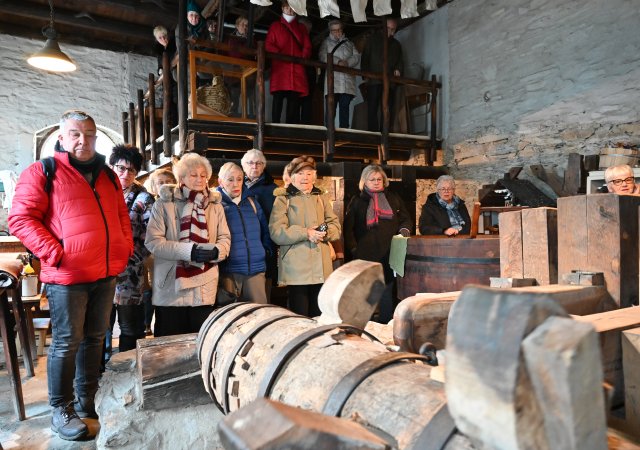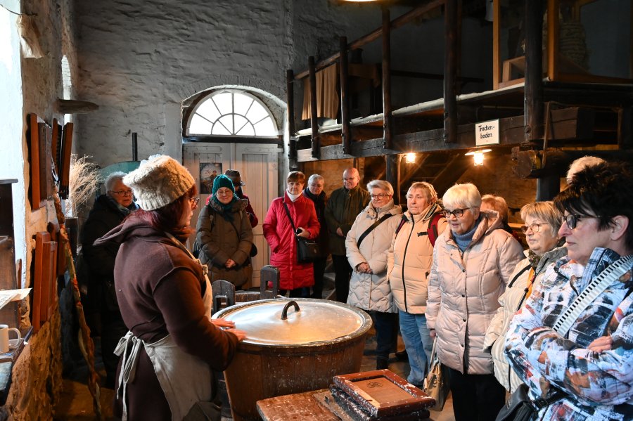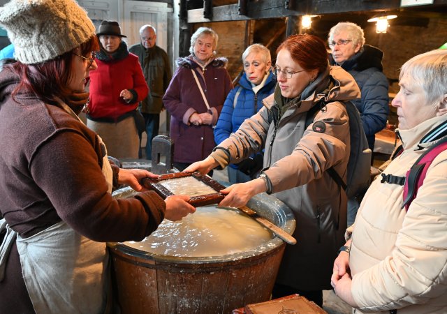 Doch zuerst ging die Fahrt nach Zwönitz, einem erzgebirgischen Kleinstädtchen, das in Erfurt kaum bekannt ist. Hier befindet sich allerdings eine historische Papiermühle, die besichtigt werden kann und in der interessierte Besucher selbst Papier auf traditionelle Art herstellen, bzw. schöpfen können. Auch wenn es in den Räumen a…kalt war, war der Besuch an diesem historischen Ort für alle ein Erlebnis und verbunden mit einem Wissensgewinn.