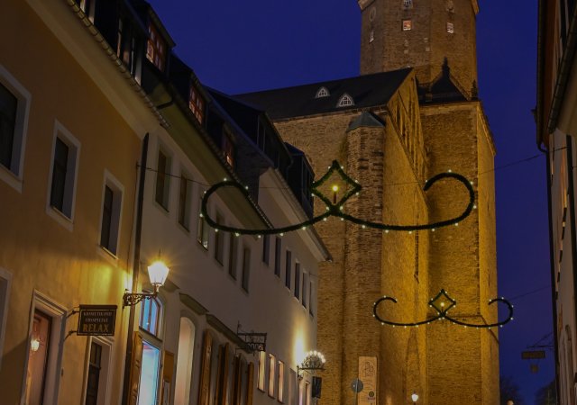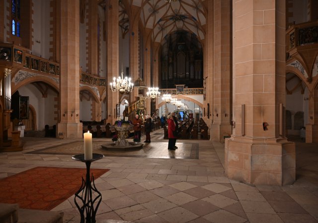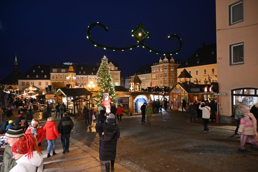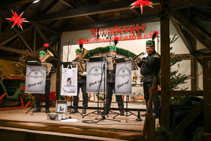 Das eigentliche Reiseziel war an diesem Tag der Weihnachtsmarkt in Annaberg-Buchholz, der im Erzgebirge einer der schönsten sein soll. Gleich neben der gewaltigen Kirche Sankt Annen war die Haltestation für Busse eingerichtet und so waren es nur wenige Meter zum kleinen, aber feinen Weihnachtsmarkt in der ehemaligen Bergarbeiterstadt. Links und rechts der Straße, die für Fußgänger freigehalten wurde, gab es zahlreiche Geschäfte mit erzgebirgischer Weihnachtskunst, die auch gut geheizt waren. Denn es war inzwischen nicht nur dunkel, sondern auch sehr kalt geworden. Der Weihnachtsmarkt, zum Glück an diesem Tag nicht übervoll, präsentierte Gaumenfreuden in flüssiger oder festerer Form, eine Blaskapelle auf der kleinen Bühne und zahlreiche Stände mit weihnachtlichen Erzeugnissen aus der Region. Wer kulturinteressiert war, besuchte auch die den Bergmannsdom St. Annen, um dessen Pracht auch von innen zu bewundern und um zu erfahren, dass ein historisches Gemälde auf einer Altarrückwand zum UNESCO-Weltkulturerbe gezählt wird.