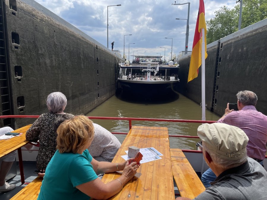 Rechts und links – oder wie unser Reeder sagen würde: links und rechts (wir fuhren flussaufwärts) – zeigten sich die Weinberge und Grün, soweit das Auge reichte. Die Orte, Kirche und Klöster des Mains waren eher zurückhaltend. Manche vermeindliche Sehenswürdigkeit konnte man selbst vom Sonnendeck nur erahnen. Darüber hinweg half uns Fränkischer Schweinebraten mit Klößen und Rotkohl – oder war es Blaukraut? – serviert im Oberdeck. Nebenbei erfuhren wir allerei Wissenswertes und mancherlei Sehmannsgarn der Main-Schifffahrt. Das eine vom anderen zu unterscheiden, blieb die Aufgabe der Gäste an Bord.