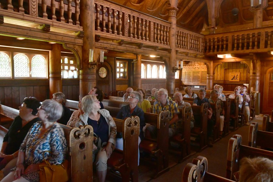 Die allgemeinen Wetterprognosen für den 5. September, dem Reisetag, waren Sonne, Sonne, Sonne und Temperaturen über 30 Grad Celsius. Doch im Gebirge angekommen, empfing die Reisegäste ein frisches Lüftchen. Auch wenn der von Busfahrer Christian versprochene Kaffee ausfallen musste, weil sowohl der Busparkplatz als auch die Toiletten an der Talstation der Kabinenbahn nicht sofort gefunden wurden. Die Reisegruppe traf trotzdem pünktlich an der Stabkirche in Hahnenklee ein, um hier bei einem Vortrag etwas über dieses besondere Bauwerk zu erfahren. Da Fichtenholz deutlich preiswerter war als Stein auf Stein zu mauern, hat sich die Gemeinde Anfang des 20. Jahrhunderts für einen Holzbau entschieden. Entstanden ist ein Meisterwerk, dass heute sogar von norwegischen Reisegesellschaften aufgesucht wird.