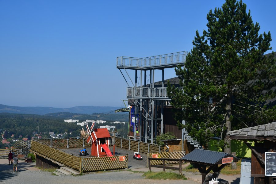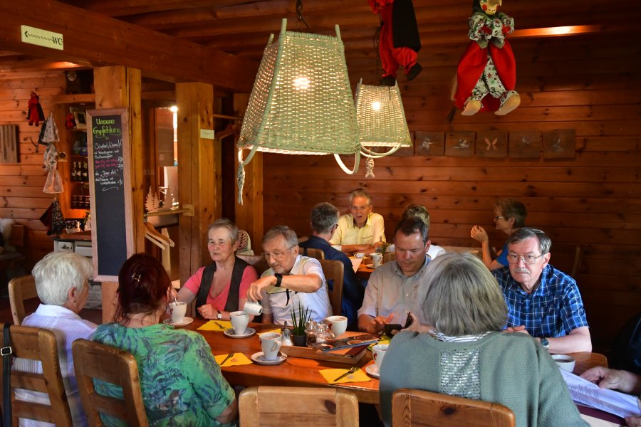 Nach dem Genießen der schönen Aussicht und der Betrachtung spektakulärer Freizeitaktivitäten rumpelte die Seilbahn wieder ins Tal und der Bus fuhr für einem Abstecher nach Torfhaus, denn hier gab es einen neu errichteten Turm, dessen Besteigung der Höhepunkt der nächsten Harztour werden könnte, auch weil im Inneren vorsorglich ein Lift eingebaut wurde. Nur wenige Kilometer weiter begann die geplante Wanderung zum Waldcafé Forellenteich. Nach etwa einem Kilometer war das versteckte Kleinod erreicht, so dass ein Streckenposten die schon teilweise erschöpften Wanderer am Vorbeigehen hindern musste. Alle diese Mühen haben sich aber gelohnt. Auf einem gut gefüllten Teller gab es selbst gebackenen Kuchen drapiert mit einer Portion Sahne und Kaffee satt. Die erfahrenen Mitfahrer waren voll des Lobes über die wunderbare Kaffeetafel in der versteckten Waldgaststätte. Appetit auf Abendbrot hatten nach dem kalorienreichen Schlemmen an diesem Tag sicher die Wenigsten.