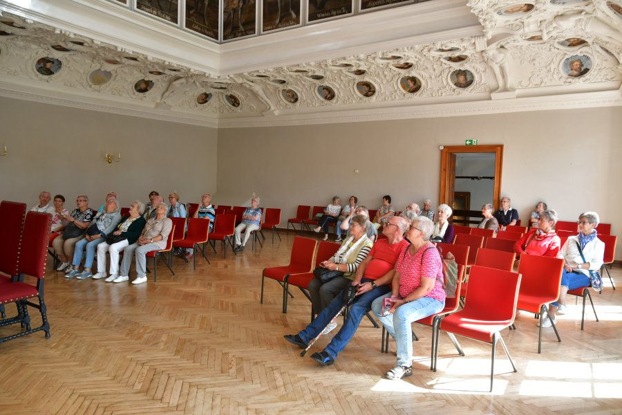 Angemeldet hatten sich deutlich mehr Interessenten für die Fahrt ins Schwarzatal und so gab es leider ein paar Absagen, weil der Bus bis auf den letzten Platz ausgebucht war. Nach der obligatorischen Stadtrundfahrt zu den zwei anderen Ladestationen lenkte Steffen seinen Sportbus zum Schloss Schwarzburg. Hier gelang es, die Reisegruppe zu teilen und eine begab sich zum Kaisersaal und die andere in das 2018 eröffnete Zeughaus mit seiner einzigartigen Waffensammlung.