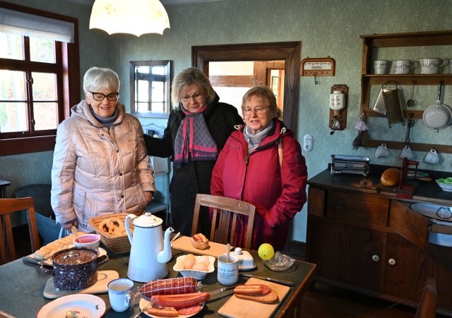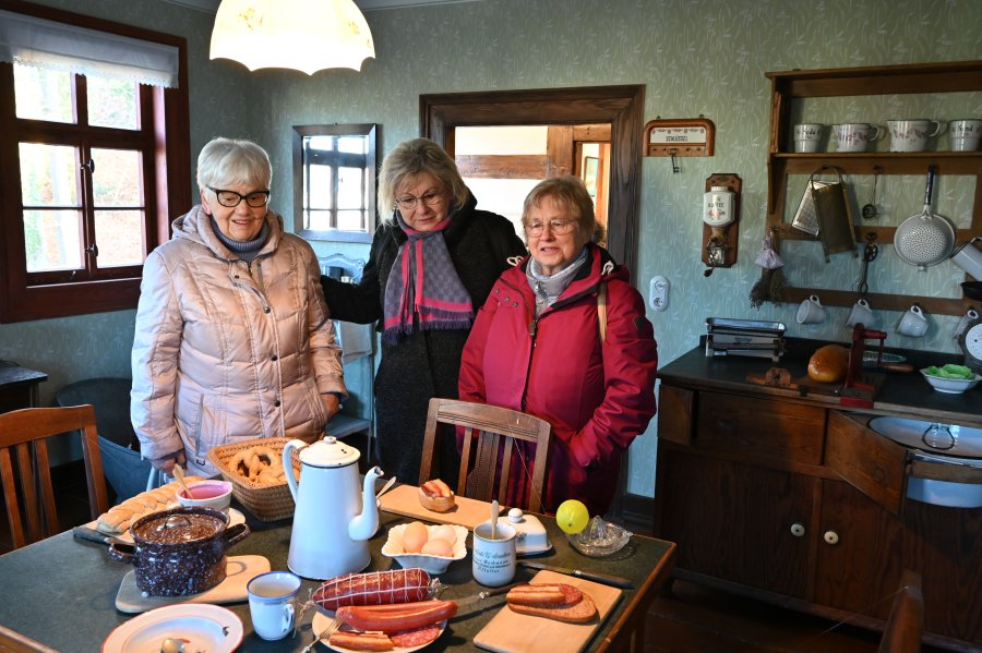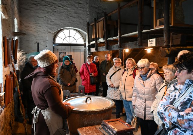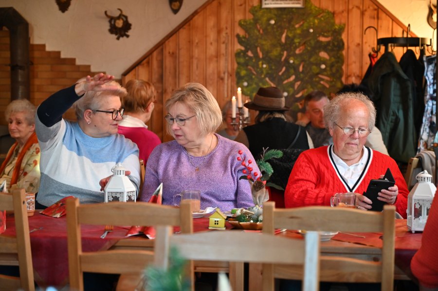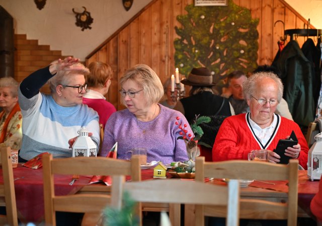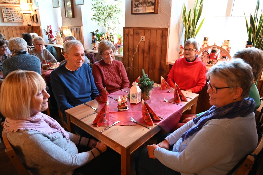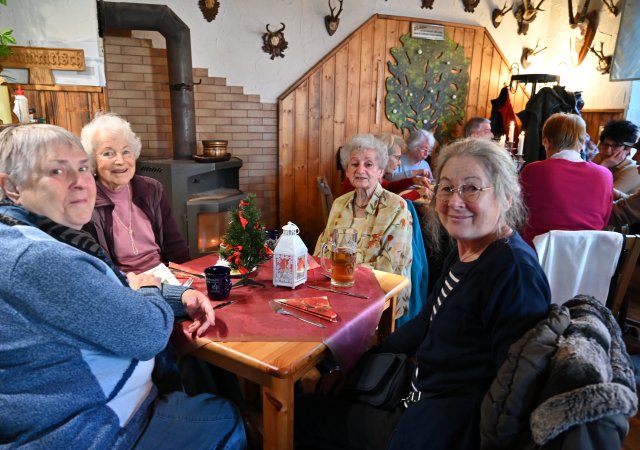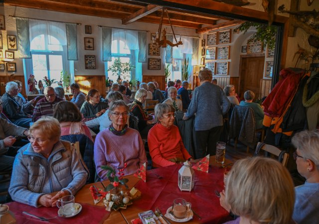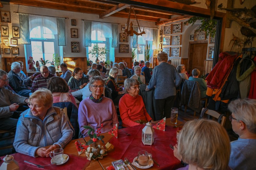 Zum Mittagessen fand man im Traditionsgasthaus „Zur Linde“ wieder zusammen und wer etwas durchgefroren war, begann die Mittagspause mit einem Glühwein. Der umtriebige Wirt und sein Sohn sorgten für schnellen Nachschub. Auch wenn es Gänsebraten gab, wählten doch die meisten Gäste den sächsischen Sauerbraten aus. Er war bisher auf allen unseren Erzgebirgsfahrten das kulinarische Highlight.