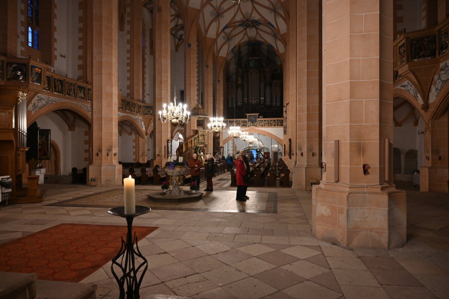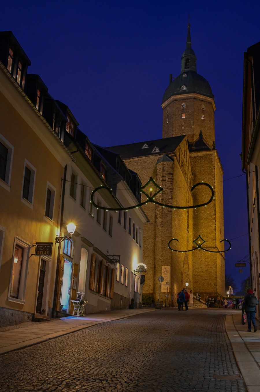 Das eigentliche Reiseziel war an diesem Tag der Weihnachtsmarkt in Annaberg-Buchholz, der im Erzgebirge einer der schönsten sein soll. Gleich neben der gewaltigen Kirche Sankt Annen war die Haltestation für Busse eingerichtet und so waren es nur wenige Meter zum kleinen, aber feinen Weihnachtsmarkt in der ehemaligen Bergarbeiterstadt. Links und rechts der Straße, die für Fußgänger freigehalten wurde, gab es zahlreiche Geschäfte mit erzgebirgischer Weihnachtskunst, die auch gut geheizt waren. Denn es war inzwischen nicht nur dunkel, sondern auch sehr kalt geworden. Der Weihnachtsmarkt, zum Glück an diesem Tag nicht übervoll, präsentierte Gaumenfreuden in flüssiger oder festerer Form, eine Blaskapelle auf der kleinen Bühne und zahlreiche Stände mit weihnachtlichen Erzeugnissen aus der Region. Wer kulturinteressiert war, besuchte auch die den Bergmannsdom St. Annen, um dessen Pracht auch von innen zu bewundern und um zu erfahren, dass ein historisches Gemälde auf einer Altarrückwand zum UNESCO-Weltkulturerbe gezählt wird.
